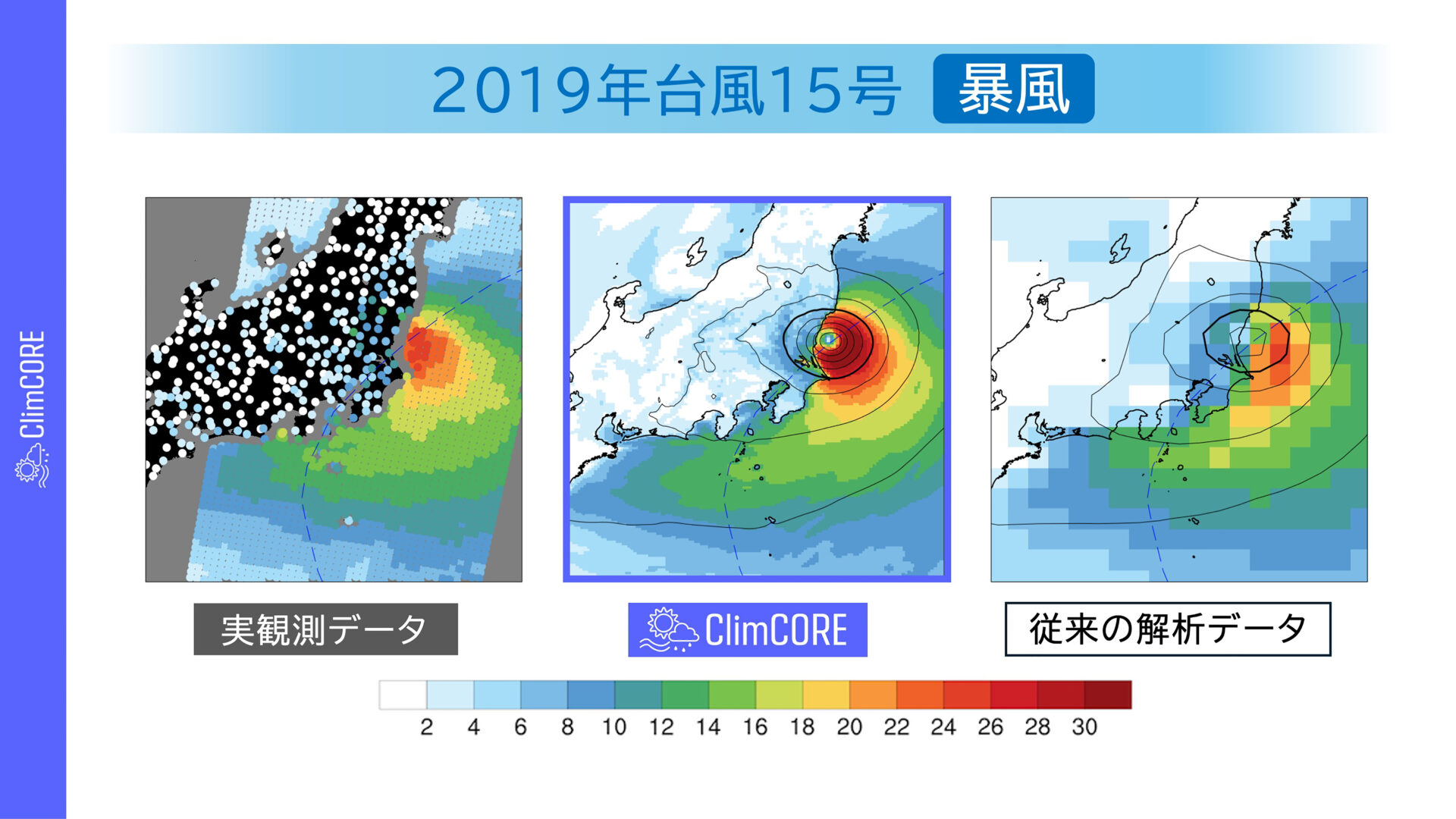 画像を比較してみると、台風のどの部分の風がどれぐらい強いかという分布が、従来の解析データ(※)より「ClimCORE」の再解析データのほうがよりリアルに近く表現されています。