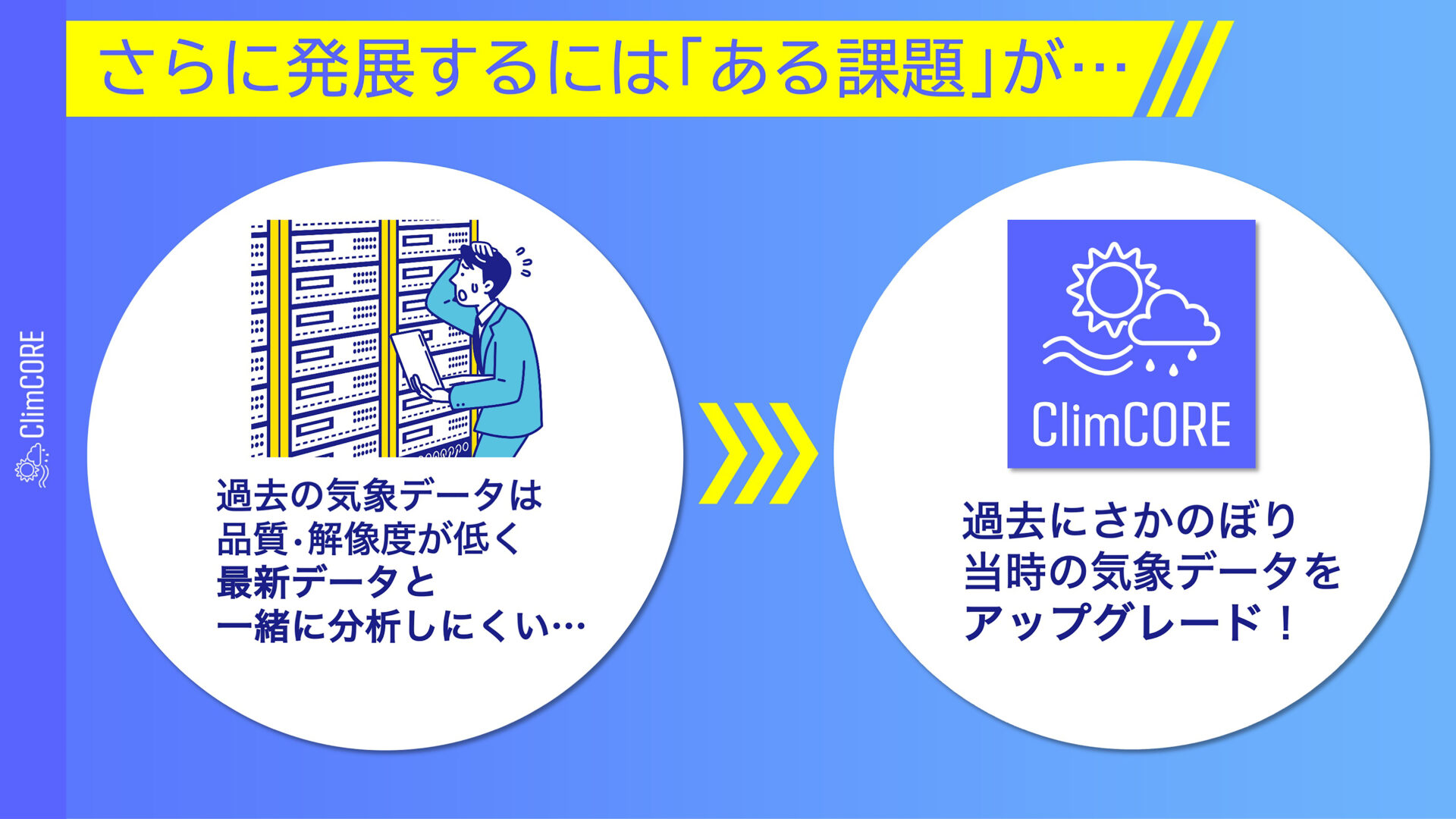 この課題を解決するため、2020年から始まったのが「ClimCORE」(クライムコア)です。過去にさかのぼり、当時の気象データを次々と今のデータ品質にアップグレードしているんです。