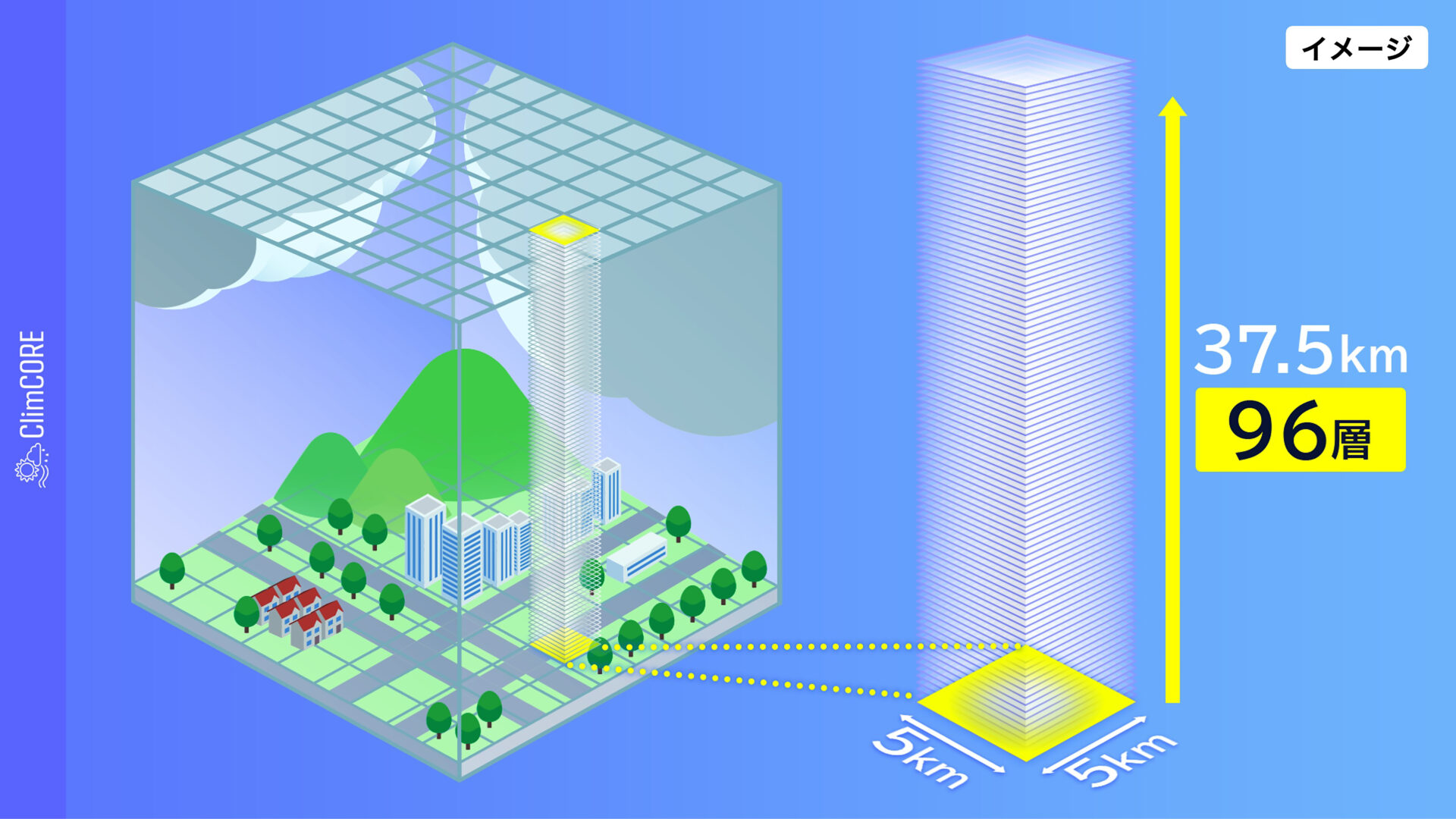 「再解析」は、地表から上空まで水平方向は5キロ四方に、上空は37.5キロまでを96の層に切って行っています。