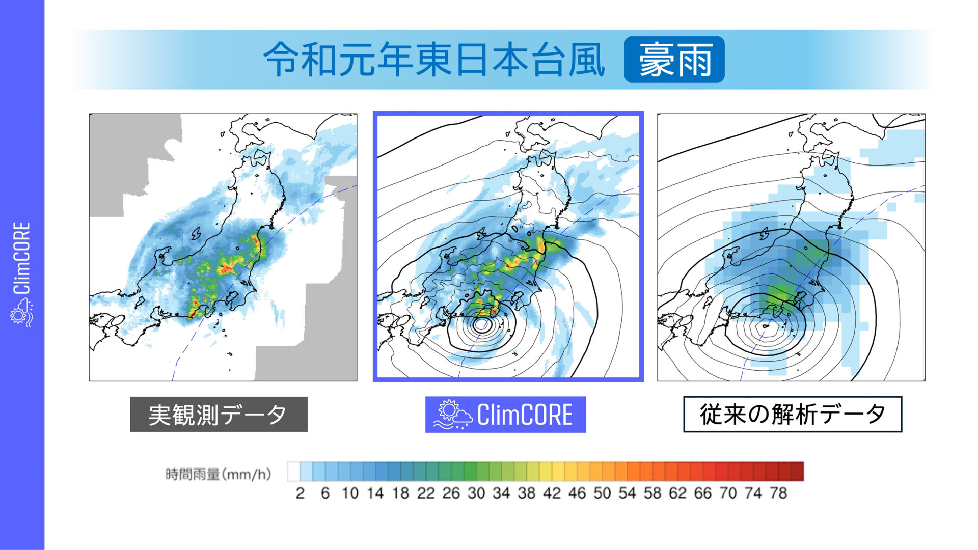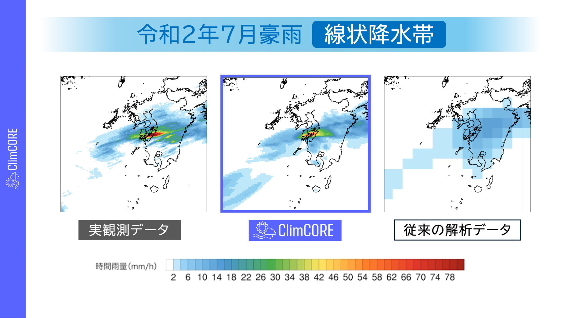 このときの豪雨の様子を見てみると、従来の解析データ(※)では表現し切れていなかった局地的な雨の強弱が「ClimCORE」の再解析データでははっきりと表現され、実際の観測データに近いことが分かります。